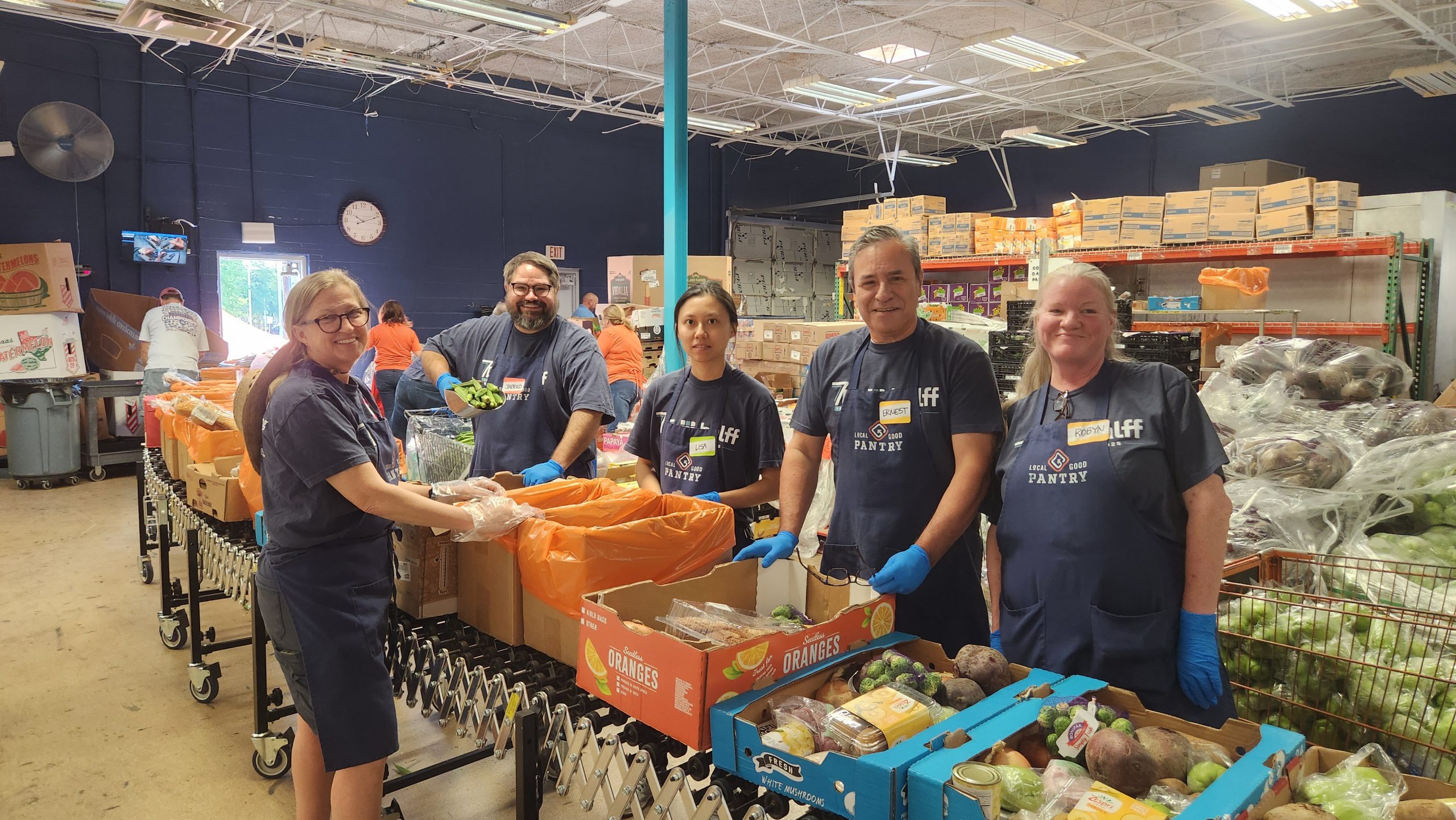 In Richardson, HCI volunteers take a break to pause for a photo while putting together produce at the Local Good Pantry.